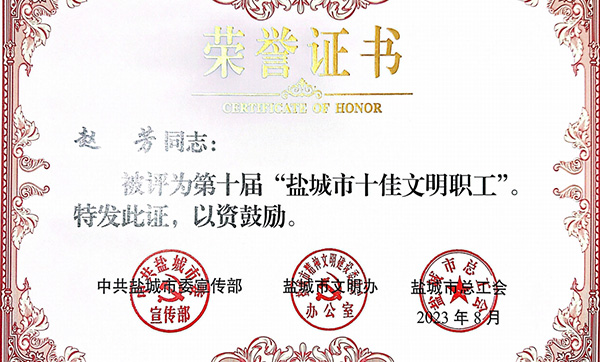 港城公司趙芳獲“鹽城市十佳文明職工”和 “五一勞動(dòng)獎(jiǎng)?wù)隆狈Q(chēng)號(hào)